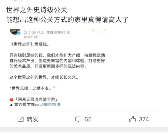从几次事件的连锁反应来看,玩家对《世界之外》的信任似乎已经没那么多了,信任的建立需要长期积累,但一次轻率的决策、一次敷衍的公关就可能让多年积累化为乌有,微博热搜上#世界之外史诗级公关#被无数玩家拿来调侃。